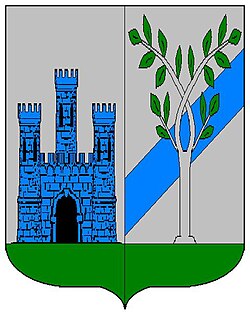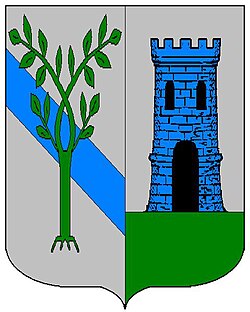 (HR) Vodoravna podjela gredom. Vodoravna greda se sastoji od šest desno kosih greda redom srebrena, crvena, plava, srebrena, crvena, plava. Iznad grede srebreno polje, na polju polovica zlatnog lava, ispod grede na crvenom polju zlatni cvijet (ruža). [1/9] |