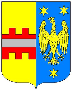 (HR) Okomita podjela. Lijevo zlatno polje dijeli uokvirena vodoravna srebrena greda, greda je gore uokvirena crvenom gredom s dva ravna zuba, greda je dolje uokvirena crvenom gredom s dva utora. Desno na plavom polju zlatni orao, iznad orla dvije šestero krake zlatne zvijezde, ispod orla jedna šestero kraka zlatna zvijezda . [1/13, 2/19] | |