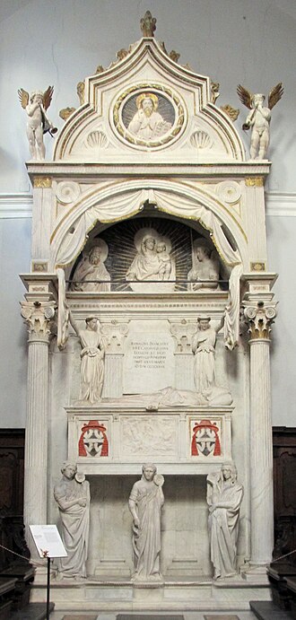 Sama grobnica je zatvorena u arhitektonski okvir koji nose tri karijatide. Prednja strana sarkofaga ima dva grba sa strane i stiacciato reljef "Uznesenja Djevice" koji je izradio Donatello. Iznad njega je ležeći portret kardinala i dva anđela koji otvaraju kamenu draperiju koja visi s luka. Iza njih je luneta s reljefom "Bogorodice između dva sveca".