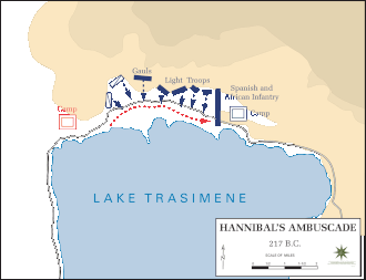 Krećući se padinom u blizini Trazimenskog jezera, rimski general šalje izvidnicu koja mu nakon nekog vremena javlja o kartaškoj vojsci koja ide ravno prema njima. Izvidnici nisu uočili da je velika većina Hanibalove sile skrivena u obližnjoj šumi, samo čekajući na znak svog vođe. Kada je rimska vojska, ponovo brojčano nadmoćna, zagrizla mamac, iz šume su izletili divlji galski plaćenici i afričke postrojbe s takvom žestinom da Rimljani nisu znali što drugo napraviti, nego bježati. No, oni koji su ostali i borili se, imali su više sreće od onih koji su se bacili u bijeg, jer svi koji su se pokušali povući bili su, ili pobijeni, ili pobacani u hladne vode Trazimenskog jezera.