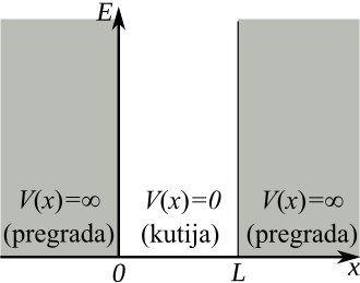 - Obrada nije uspjela. (MathML sa SVG ili PNG za rezervu (preporučljivo za moderne preglednike i alate za pristupačnost): Invalid response ("Math extension cannot connect to Restbase.") from server "https://wikimedia.org/api/rest_v1/":): {\displaystyle V(x) = \begin{cases} 0, & x_c-\tfrac{L}{2} < x <x_c+\tfrac{L}{2},\\ \infty, & \text{za ostalo,} \end{cases}, }