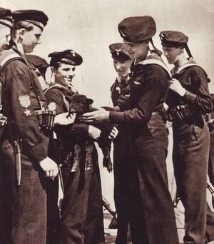 Pripadnici Hrvatske pomorske legije, u uniformama njemačke Kriegsmarine, s hrvatskim grbom na rukavu