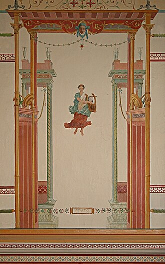 U Pompejanskoj sobi kao u čitanci iz klasične starine, tema je razrađena kompleksnije s likovima i prizorima, koji simboliziraju kulturu, odgoj i etičke vrline grčko-rimskog svijeta. Na istočnom zidu Tišov je predstavio Zeusa, a Čikoš borbu Herkula s divom Antejem. Na južnom je zidu ČikoSevo Šakanje, disciplina u metodi odgoja i u olimpijskim igrama. Nastavlja se u uglu TišovIjev Bahantski prizor Ivekovićev Ratni prizor. Na zapadnom je zidu Čikošev Okovani Prometej. Na sjevernoj strani dva su polja s Ivekovićevom pričom o tračkom pjevaču Orfeju s mrtvom Euridikom i Čikoševom pjesnikinjom Sapfom s Lezbosa. Svi su prizori, kao i na stubištu, u iluzionistički oslikanim arhrtektonskim okvirima. Prate ih u medaljonima portreti Homera, Sokrata, Euripida, Sofokla, Tukidida, Hipokrata, Perikla i Trajana signirani Kovačevićem, Ivekovićem i Čikošem. Sve različito obojene plohe zida s dominantnom crvenom pompejanskom bojom, ispunjene su osobito uspjelim glavama satira, biljnim, životinjskim i geometrijskim motivima iz repertoara ukrašavanja pompejanskih kuća. Raspored ploha prema podlošcima III. i IV. pompejanskog stila načinio je Clausen. Oslikavanje stubišta i ove sobe završeno je 1892. godine. Kad je 1913./1914. godine dozidan kat, strop je stradao pa ga je Čikoš sa svojim učenicama pokušao obnoviti, vjerojatno prema prvotnom osliku.