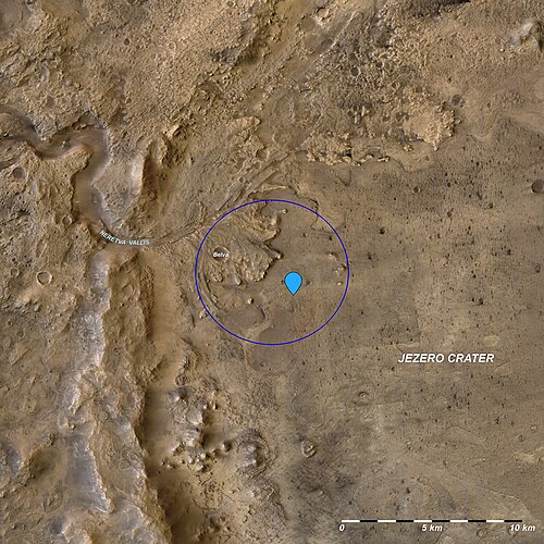 U studenom 2018. godine objavljeno je da je krater Jezero izabran za mjesto slijetanja za planiranu misiju rovera Mars 2020.[10][11][12][13] Tamo je sletio 18. veljače 2021. godine. Vjeruje se da krater sadrži velike količine između 3,9 do 3,5 milijardi godina starog sedimenta, a cilj misije je istraživanje znakova drevnog života. Rover će prikupiti 30 uzoraka tla koji će biti vraćeni na Zemlju budućom svemirskom letjelicom koju planira NASA. Uzorci bi mogli na naš planet stići 2026. godine. Misija će biti ključna i za buduće ljudske misije na tom planetu.[14]