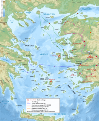 Perzijske snage u Maloj Aziji su se 497. pr. Kr. pregrupirale, te su tri Darijeva zeta (Dauris, Hijam i Otan) podijelila snage na tri dijela i preuzeli zapovjedništvo nad njima[79]. Herodot tvrdi kako su navedena tri generala podijelila pokorena područja na tri dijela, nakon čega su krenuli u pohod svaki na svoj cilj[80].
