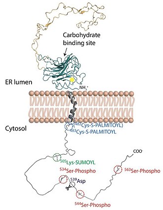 Molekularnim kloniranjem i karakterizacijom otkriveno je da se radi o membranskom proteinu tipa 1, slične strukture kalretikulinu. Dano mu je ime kalneksin. On, zajedno s kalretikulinom i ERp57 (također poznat kao PDIA3), tvori ključne komponente puta koji olakšava savijanje i kontrolu kvalitete novosintetiziranih proteina s N-povezanim bočnim lancima ugljikohidrata.[1]