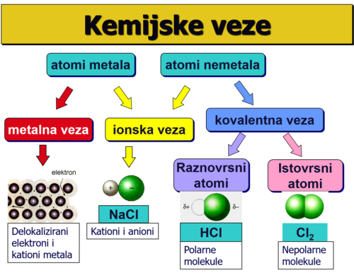 Tri su vrste kemijske veze prema jačini ionska, kovalentna i metalna veza a postoje i druge slabije veze.