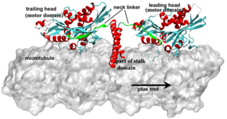 U početku su obje motoričke domene snažno vezane za mikrotubule te je inhibirano vezanje ATP-a na vodeću motoričku domenu. Otpuštanje anorganskog fosfata (Pi) iz zaostale motoričke domene potiče njezino odvajanje od mikrotubula nakon čega vodeća domena veže ATP. Time je potaknuto povlačenje zaostale motoričke domene na sljedeće vezno mjesto duž mikrotobula čime ona postaje novom vodećom domenom. Nakon zamijene položaja dviju domena, nova vodeća domena čvrsto je vezana i otpušta ADP. Zaostala domena podvrgava se hidrolizi ATP-a i otpušta Pi za nastavak ciklusa.[1][4]