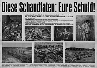 Američki odjel za psihološko ratovanje i Britanski odjel za psihološko ratovanje bila je jako učinkovita u svojoj propagandi u Njemačkoj poslije rata u cilju stvaranja klime i osjećaja kolektivne krivnje za koncentracijske logore i ratne zločine koje su izvršili njihovi sunarodnjaci za vrijeme 2. Svjetskog rata. Nakon oslobađanja koncentracijskih logora, saveznički vojnici koji su bili zatečeni s ljudskom mizerijom i patnjom, bez suda s ubijali zarobljene njemačke vojnike. Dok su žene bile sistematski silovane od strane ruskih snaga, i procijene su da je preko dva milijuna žena bilo silovano. Odmah nakon dolaska okupacijskih vlasti svi koji su bili radno sposobni bili su poslani na prisilan rad na infrastrukturnim projektima. Ovo ponašanje okupacijskih vlasti je toliko pogodilo generala Pattona u kojima je on u mnogome kritizirao u svojim pismima i u svome dnevniku.[2] Iako mnogi njemački građani nisu bili direktni suučesnici u progonima i u istrebljenju, okupacijske vlasti su uspjele uvjeriti njemačku javnost i inteligenciju da njihova šutnja i neprotivljenje nacistima je u nekoj mjeri bilo odobrenje od strane cijelog naroda za njihove postupke i djela. Nedugo poslije početka propagande o kolektivnoj krivici oglasili su se njemački intelektualci: 1945. godine evangelistički teolog Martin Niemöller objavio je Stuttgarter Schuldbekenntnis (Stuttgartsku deklaraciju krivice), dok je godinu dana poslije 1946. godine filozof i psiholog Karl Jaspers objavio je niz predavanja studentima koja su kasnije bila objavljena pod naslovom "Pitanje njemačke krivice". Ova dva djela imala su veliki odjek u njemačkoj javnosti i u stvari su jako prisutne i danas u njemačkom političkom diskursu i javnom mišljenju. Kod mnogih Nijemaca, zločini nacističke vladavine i danas imaju jezoviti i paralizirajući odjek, i u neku ruku su prožeti u psihu njemačkog naroda.[3] Okupacijske snage vršile su prisilu na njemačko stanovništvo tako što su ih tjerali na otkopavanje žrtava iz masovnih grobnica bez maski, rukavica ili druge zaštitne opreme koja je njima bila dostupna. Isto tako okupacijske vlasti su tjerali stanovništvo u razne logore tako da bi pokazali na djela koja su učinili njihovi sugrađani. Na javnim mjestima okupacijske vlasti bile su izvješeni razni plakati i slike sa stratišta, dok su okupacijske snage u kinima puštali razne sadržaje o veličini njemačkog zločina.