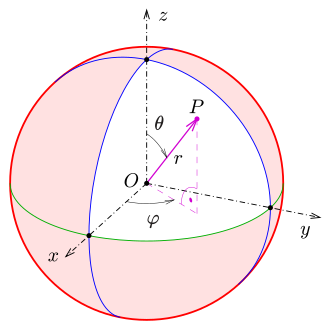 Sferni koordinatni sustav određen je ishodištem O i međusobno okomitim polupravcima p i z. Nekoj točki P pridružuju se koordinate (r, φ, θ) gdje je r koordinata jednaka udaljenosti od ishodišta do točke P, koordinata φ kut je od projekcije vektora OP na ravninu okomitu na poluos z i koordinatu θ, θ je kut koji vektor OP zatvara s poluosi z. Sve su točke prostora jednoznačno određene kad su vrijednosti sfernih koordinata ograničene: 0 < ρ < ∞, –π < φ < π, 0 < θ < π.