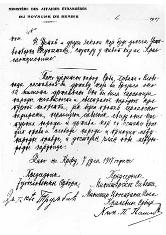 Članovi Jugoslavenskog odbora zastupali su narodno jedinstvo, pravo samoodredbe naroda, ravnopravnost u organizaciji buduće države i integralno ujedinjenje, a Nikola Pašić ideju velikosrpstva, te je u sjedište izbjegličke srbijanske vlade na otoku Krfu, pozvao predstavnike Jugoslavenskog odbora. Nakon mjesec dana pregovaranja Nikola Pašić, kao predstavnik srpske vlade i Ante Trumbić kao predstavnik Jugoslavenskog odbora, potpisali su Krfsku deklaraciju, prilično nejasan i dvosmisleni dokument. Krfsku deklaraciju prihvatio je i Crnogorski odbor za narodno ujedinjenje 27. kolovoza 1917.