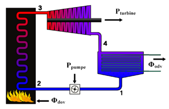 Toplinska energija vodene pare pretvara se u mehanički rad u parnim strojevima kod kojih je nosilac topline vodena para. Vodena para se razvija u parnom kotlu (generator pare) kojem se izgaranjem goriva dovodi toplina. Iz parnog kotla odlazi para u parni stroj gdje adijabatski ekspandira na viši tlak, pa se dio toplinske energije pretvara u mehanički rad. Odušna para, to jest para koja izlazi iz parnog stroja nakon izvršenog rada, odlazi u parni kondenzator, gdje vlada niža temperatura. U parnom kondenzatoru se pari ohlađivanjem odvodi toplina i para se pretvara u kondenzat, to jest u vodu. Ta neiskorištena količina topline je uvijek manja od količine topline koj se dovodi parnom kotlu. Kondenzat se iz parnog kondenzatora siše i tlači pomoću sisaljke natrag u parni kotao. Odnos između količine topline koja se pretvorila u mehanički rad i primljene količine topline naziva se termički ili toplinski stupanj iskoristivosti kružnog procesa. On je viši što je viša temperatura pare u parnom kotlu i što je niža temperatura vode u parnom kondenzatoru. [2]