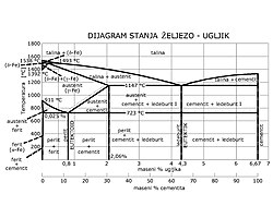 - nelegirani čelik: [Fe3C] → 3[Fe] + [C]