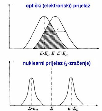 Prema tome, energija uzmaka je puno veća za nuklearne prijelaze (Egama ≈ 105 eV, ER ≈ 10-3 eV), nego za prijelaze u elektronskim nivoima atoma (Eel ≈ 1 eV, ER ≈ 10-11 eV). Posljedica toga je smanjenje energije emitiranog kvanta zračenja za iznos energije uzmaka. Na ovaj se način, energija emitiranog kvanta zračenja, to jest emisijska linija, pomiče prema nižoj vrijednosti od energije nuklearnog prijelaza, dok se apsorpcijska linija pomiče prema višoj energiji za isti iznos ER, što je razlog neuspjeha pri pokušaju postizanja rezonancijske apsorpcije nuklearnog gama zračenja.