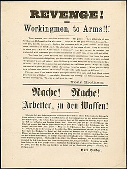 Ogorčeni ovim činom policijskog nasilja, lokalni anarhisti ubrzo su započeli tiskati i distribuirati letke pozivajući na okupljanje sljedećeg dana na trgu Haymarket, koji je tada bio trgovačko središte okruga. Letci tiskani na njemačkom i engleskom jeziku izjavili su da je policija ubila štrajkače u ime poslovnih interesa, i pozvali su radnike da traže pravdu. Podijeljeno je više od 20 000 primjeraka letaka.[29]