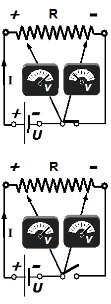 Napon izvora U (V) tjera strujni tok jakosti I (A) kroz otpornik R. Na krajevima otpornika napon je jednak naponu izvora, što znači da duž otpornika napon nije svagdje jednak, nego se smanjuje od pozitivnog kraja prema negativnom, kako pokazuju voltmetri na desnoj slici. Veći napon na stezaljkama izvora (dakle i na krajevima otpornika) protjerat će jaču struju kroz otpornik, a među pojedinim točkama otpornika i razlike u naponu bit će veće. Prekinemo li strujni tok, otpornik će u svim točkama imati isti napon jednak naponu stezaljke na koju je priključen, kao što prikazuje donja slika. Slijedi, da razlike u naponu pojedinih točaka otpornika postoje samo u zatvorenom strujnom krugu, ako kroz njega protječe struja. Pokusima se može pokazati, da je pad napona na bilo kom odsječku - dijelu otporne žice to veći, što je veći otpor između mjernih točaka i što je jača struja koja teče kroz otpornik. Matematički se pad napona može odrediti po izrazu: