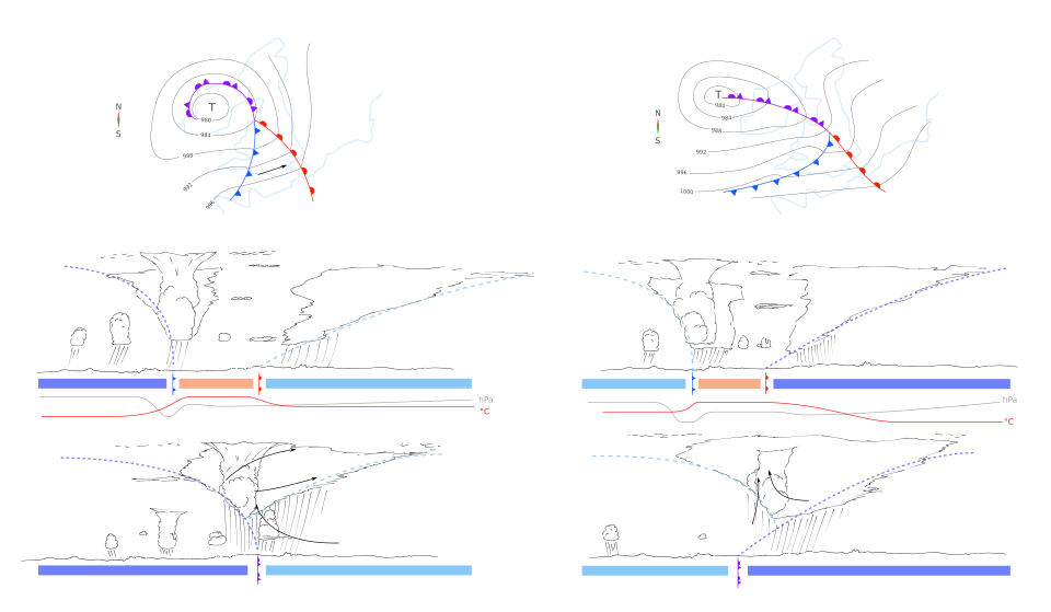 Svojstvene vremenske pojave vezane uz toplu, odnosno hladnu frontu bitno su različite.