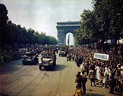14. lipnja, 1940., pet tjedana nakon početka bitke za Francusku, Paris je pao pod njemačku okupaciju, koja je potrajala do oslobođenja Pariza u kolovozu 1944., nakon ustanka pokreta otpora, dva i pol mjeseca nakon nakon iskrcavanja u Normandiji.[32] Središnji Pariz drugi svjetski rat prošao je uglavnom neoštećen, jer nije bilo strateških ciljeva za savezničke bombardere (željezničke su stanice u centralnom Parizu terminali, dok su glavne tvornice locirane u predgrađima). Također, njemački general Dietrich von Choltitz nije izvršio Hitlerovo naređenje o uništenju svih pariških znamenitosti prije njemačkog povlačenja.[33]