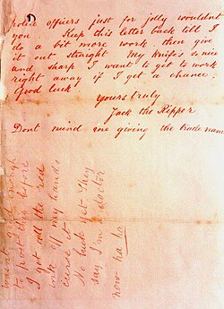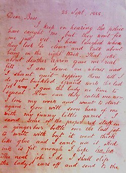 I keep on hearing the police have caught me but they wont fix me just yet. I have laughed when they look so clever and talk about being on the right track. That joke about Leather Apron gave me real fits. I am down on whores and I shant quit ripping them till I do get buckled. Grand work the last job was. I gave the lady no time to squeal. How can they catch me now. I love my work and want to start again. You will soon hear of me with my funny little games. I saved some of the proper red stuff in a ginger beer bottle over the last job to write with but it went thick like glue and I cant use it. Red ink is fit enough I hope ha ha . The next job I do I shall clip the ladys ears off and send to the police officers just for jolly wouldn't you. Keep this letter back till I do a bit more work, then give it out straight. My knife's so nice and sharp I want to get to work right away if I get a chance. Good Luck.