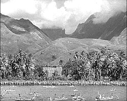Tijekom putovanja nepodnošljivost između Christiana i Bligha raste sve više pogotovo nakon što Christian otvoreno kritizira Blighov način upravljanja brodom. Kada brod dođe na svoje odredište, otok Tahiti, gdje posada mora pronaći i donijeti na brod biljku hljebovac kako bi je odnijela kući (što je uostalom bio i glavni zadatak putovanja) Bligh kažnjava Christiana na način da mu ne dopušta odlazak s broda tijekom njihova boravka na obali. U međuvremenu Byam se nastanjuje na obali i živi s poglavicom Hitihiti (William Bambridge) te njegovom kćerkom Tehanni (Movita Castaneda) te se bavi prevođenjem engleskog rječnika na jezik Tahitija. Hitihiti nagovara Bligha da dopusti Christianu jedan dan provoda na otoku. Bligh pristaje, ali se vrlo brzo predomišlja iz čistog prkosa. Ipak, Christian se oglušuje na njegovu naredbu i provede jedan dan van broda na otoku u romansi s Tahiti djevojkom Miamiti (Mamo Clark). Christian joj obećava da će se jednoga dana vratiti.
