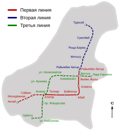 | Linija 1 | Rajimbek batir ↔ Alatau | 2011. | 8,56 km | 7 |