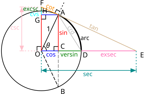 | Haversinus | Obrada nije uspjela. (Conversion error. Server ("https://wikimedia.org/api/rest_") reported: "Cannot get mml. Server problem."): {\displaystyle \operatorname {haversin} (\theta )} | Obrada nije uspjela. (Conversion error. Server ("https://wikimedia.org/api/rest_") reported: "Cannot get mml. Server problem."): {\displaystyle {\frac {1-\cos(\theta )}{2}}} |
