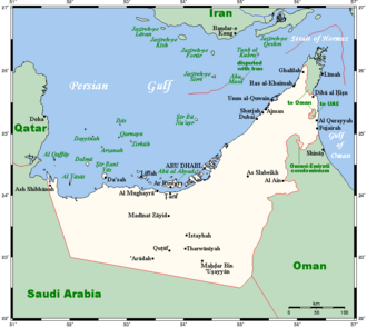 Zemljovid UAE koji pokazuje granicu prije 1974; dok su Katar i UAE imali kopnenu granicu.