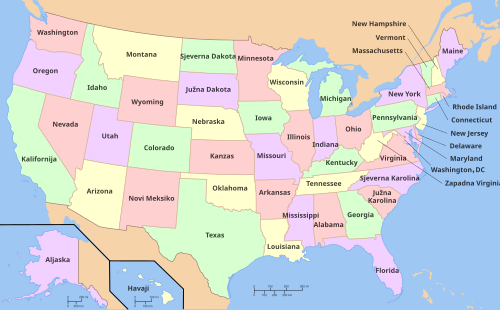 Karta Sjedinjenih Američkih Država s imenima saveznih država. Aljaska i Havaji prikazani su na dnu