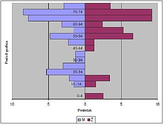 Pojava da uopće nema muške djece do 10 godina starosti, da nedostaje ženska populacija između 20 i 40 godina i da, brojčano slabije, hipertrofiraju dobne skupine iznad 65 godina, govore da je vitalitet stanovništva drastično smanjen, fertilitet praktično ne postoji, a mortalitet, uz iseljavanje postaje glavni i najutjecajniji činilac promjene stanovnika.