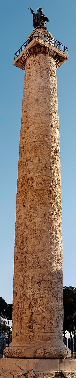 Trajanov stup je djelo vojnog inženjera Apolodora iz Damaska koji je sam bio sudionik Trajanovog pohoda u Daciju te je poput pisca putopisa upijao senzacije pojavnog svijeta: detalje krajolika, trk životinja, pojedinosti ljudske anatomije, oružja i odjeće, raznih plovila, ratnih strojeva, karaula i dr. Sve je to Apolodor ugradio u prizore preko 190 metara dugog reljefa s više od 2,500 figura, što se poput dugog kamenog papirusa obavija oko šupljeg stupa s unutrašnjim zavojitim stubištem. Spiralni tok trake omogućuje kronološki kontinuitet prikaza koji se nikako drukčije ne bi mogao postići. U njegovoj bazi je izgrađena cela (svetište) za zlatnu urnu – hranište careva pepela, a na vrhu stupa – kruništu, uzdignut pozlaćen carev kip (izgubljen u srednjem vijeku, potkraj 16. stoljeća zamijenjen skulpturom sv. Petra – sveca zaštitnika grada Rima). Iako se gornje scene ne mogu vidjeti iz podnožja stupa, bile su vidljive s balkona zgrada koje su polukružno okruživale stup.