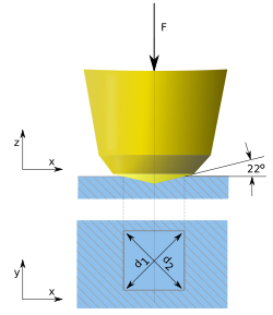 Tvrdoća po Vickersu (oznaka: HV) je mjera otpornosti što ga neki materijal pruža prodiranju dijamantne četverostrane piramide s vršnim kutom od 136º, opterećene silom F (N). Taj je vršni kut odabran prema čeličnoj kuglici promjera D (mm), koja se koristi kod ispitivanja tvrdoće po Brinellu, a ostavlja udubljenje promjera d = 0,375 D (to odgovara prosječnoj vrijednosti donje i gornje granice promjera udubljenja, koje se krece od 0,25 do 0,5 promjera kuglice D, unutar kojih su upotrebljivi rezultati ispitivanja tvrdoće po Brinellu). Udubljenje piramide daje kvadrat na površini uzorka, ali zbog netočnosti rada, nesavršenosti uzorka i sličnog (često puta je kvadrat iskrivljen), mjere se obje dijagonale kvadrata (d1 i d2) i uzima se srednja vrijednost dijagonale d. Zbog toga se rezultati ispitivanja tvrdoće po Brinellu i tvrdoće po Vickersu dobro podudaraju do 4500 N/mm2.