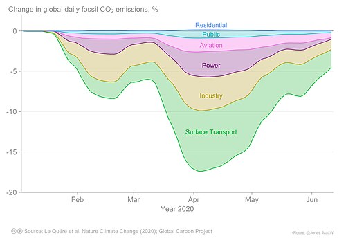 Studija objavljena u svibnju 2020. otkrila je da su dnevne globalne emisije stakleničkih plinova tijekom mjera izolacije početkom travnja pale za 17% i mogle bi dovesti do godišnjeg smanjenja emisije stakleničkih plinova do 7%, što bi bio najveći pad od Drugog svjetskog rata prema istraživačima. Ta smanjenja pripisuju uglavnom smanjenju upotrebe prijevoza i industrijskih aktivnosti.[50][51] Međutim, primijećeno je da bi povratak mogao smanjite smanjenje emisija zbog ograničenijih industrijskih aktivnosti.[52] Unatoč tome, društveni pomaci uzrokovani zaustavljanjem koronavirusa - poput raširenog rada na daljinu, usvajanja politika rada na daljinu[53][54] i upotrebe tehnologije virtualnih konferencija - mogu imati trajniji učinak izvan kratkoročnog smanjenja upotrebe prijevoza.[55] Unatoč tome, koncentracija ugljičnog dioksida u atmosferi bila je najviša ikad zabilježena u ljudskoj povijesti u svibnju 2020.[56] Stručnjak za energetiku i klimu Constantine Samaras navodi da je "pandemija najgori mogući način smanjenja emisija" te da je "tehnološka promjena, ponašanje i strukturne promjene najbolji i jedini način smanjenja emisija". Zhu Liu sa Sveučilišta Tsinghua pojašnjava da bi "tek kad bismo smanjili emisije čak i duže od toga, mogli vidjeti pad koncentracija u atmosferi". Svjetska potražnja za fosilnim gorivima smanjila se za gotovo 10% uslijed mjera protiv koronavirusa, a navodno mnogi energetski ekonomisti vjeruju da se možda neće oporaviti od krize.[57]