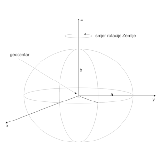 Parametar i vrijednost Opis a = 6,378,137 m Velika poluos 1/f=1/298.257223563 Spljoštenost ω=7.292115 x 10-5rad x s-1 Brzina rotacije GM = 398,600.5km3s2 Geocentrična gravitacijska konstanta C20=-J2=(-1,082.63±0.005)x10-5 2. zonalna harmonika