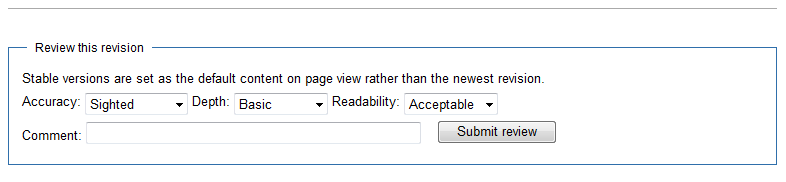 - U samom proširenju može se postaviti da u temeljnoj postavci bude Accuracy: Sighted; Depth: Unapproved; Readability: Unapproved. Prevedeno: točnost: proviđeno; dubina (poznavanje teme, odnosno količina teksta): neproviđeno; čitljivost (razumljivosti teksta): neproviđeno. Time se zaista nikome ne bi promijenilo način na koji su dosad izmjene označavane kao pregledane (ophođene), a bilo bi moguće nakon niza od koliko god izmjena IP-ova, pa zatim izmjena automatski proviđenih suradnika (samoocjenjivača), pa zatim opet izmjena IP-ova, bilo bi moguće u jednom potezu (vrativši na neku inačicu), odnosno potvrdivši sva prethodna uređivanja, označiti članak pregledanim te uštediti vrijeme i ophoditeljima i svima ostalima koji ophode.